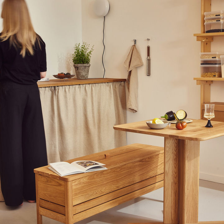 Der Square Tisch überzeugt durch eine besondere visuelle Komplexität und die perfekte Balance zwischen Leichtigkeit und Stabilität. Ein zentraler Punkt aus freischwebenden Elementen aus massiver Eiche trägt die Tischplatte, während die vier zurückgesetzten Beine optische Leichtigkeit schaffen und gleichzeitig grosszügige Beinfreiheit bieten. Ob im Wohnbereich oder in der Hotellerie und Gastronomie, der Square Tisch passt sich vielseitig an.