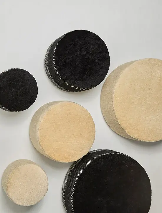 Die Seiten sind aus dem Tres Black Teppich gefertigt, während die Sitzfläche aus dem Persian Colors Teppich in mattem Schwarz besteht. Das Ergebnis ist ein Pouf, der durch seine raffinierte Kombination von Texturen und Materialien die Sinne anspricht. Erhältlich in Schwarz und Naturbeige.
